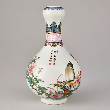 Bouteille à décor de fleur et oiseau et de poème.
